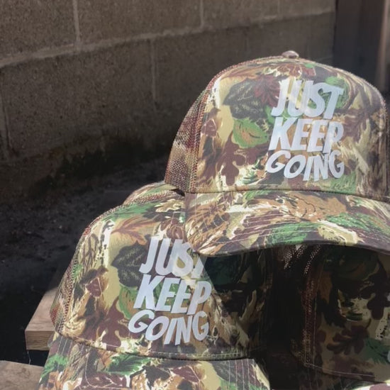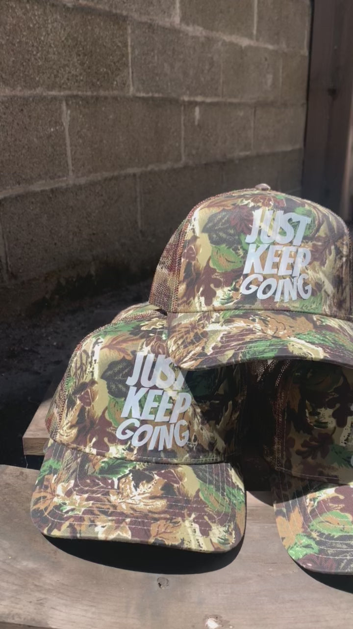 The Classic Just Keep Going Logo printed on Tree Camo Trucker Hat